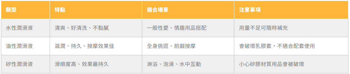 待完成最常見、也最安全的選擇。它質地清爽,容易清洗,不會在身體上留下黏膩感,而且可以搭配任何材質的情趣用品或保險套使用。如果這是你第一次接觸潤滑液,從水性潤滑液開始準沒錯。
