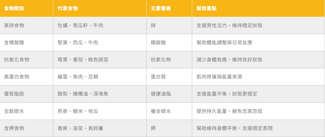 好的脂肪對男生非常重要。酪梨含有健康的單元不飽和脂肪酸,橄欖油適合日常烹調,深海魚則富含對身體有益的脂肪酸。這些脂肪能幫助調整狀態,讓整體反應更有力。