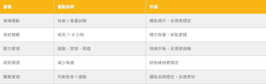 過重或過瘦都會影響表現。保持均衡飲食,搭配適度運動,讓體重維持在健康範圍,能讓身體在最佳狀態下運作,自然也會帶來更穩定的反應。